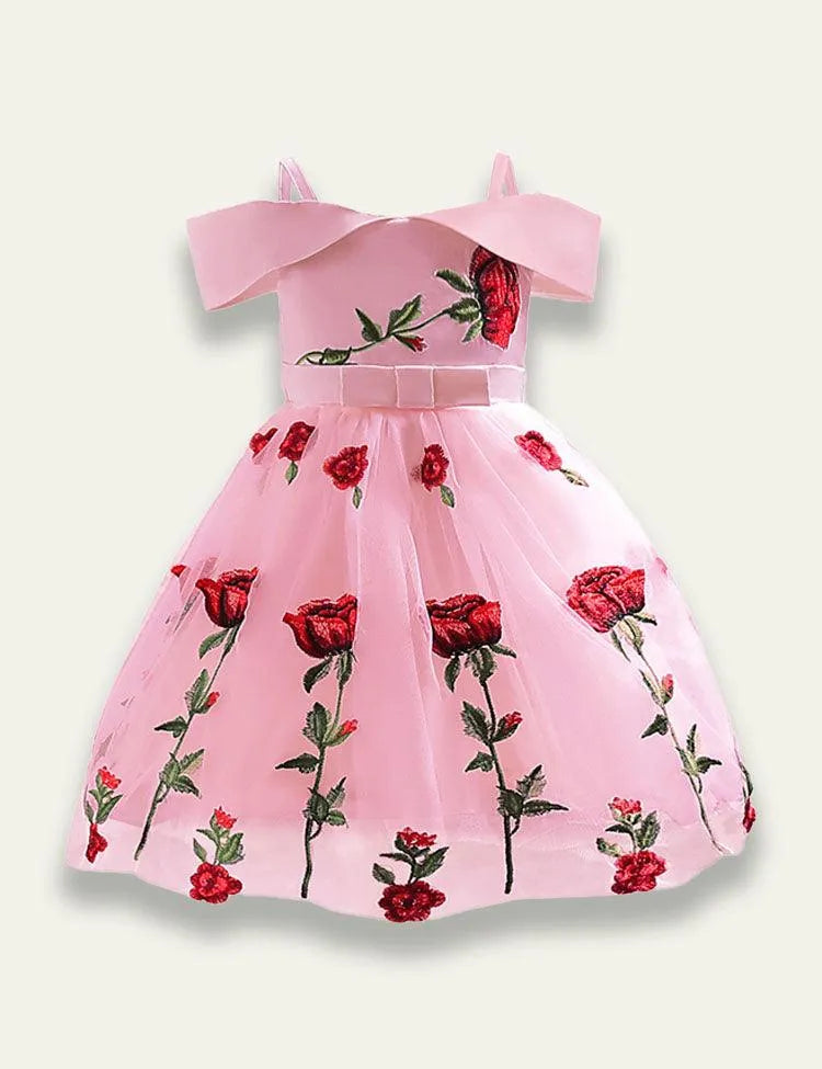 Off Shoulder Rose Embroidered Mesh Party Dress