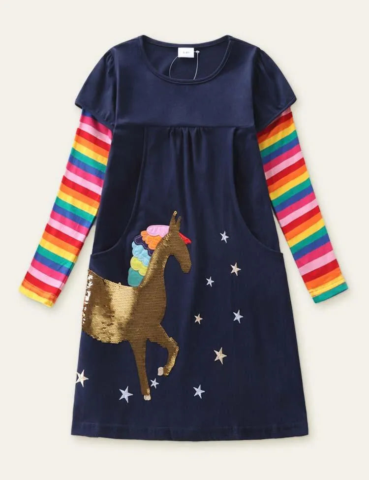 Sequined Unicorn Appliqué Star Embroidered Rainbow Dress