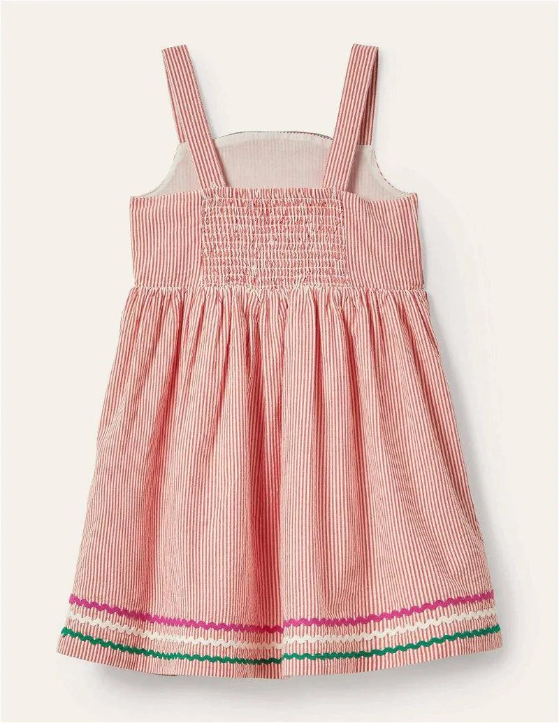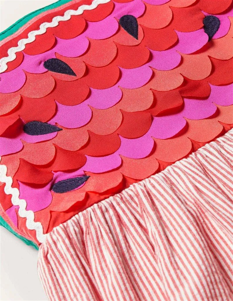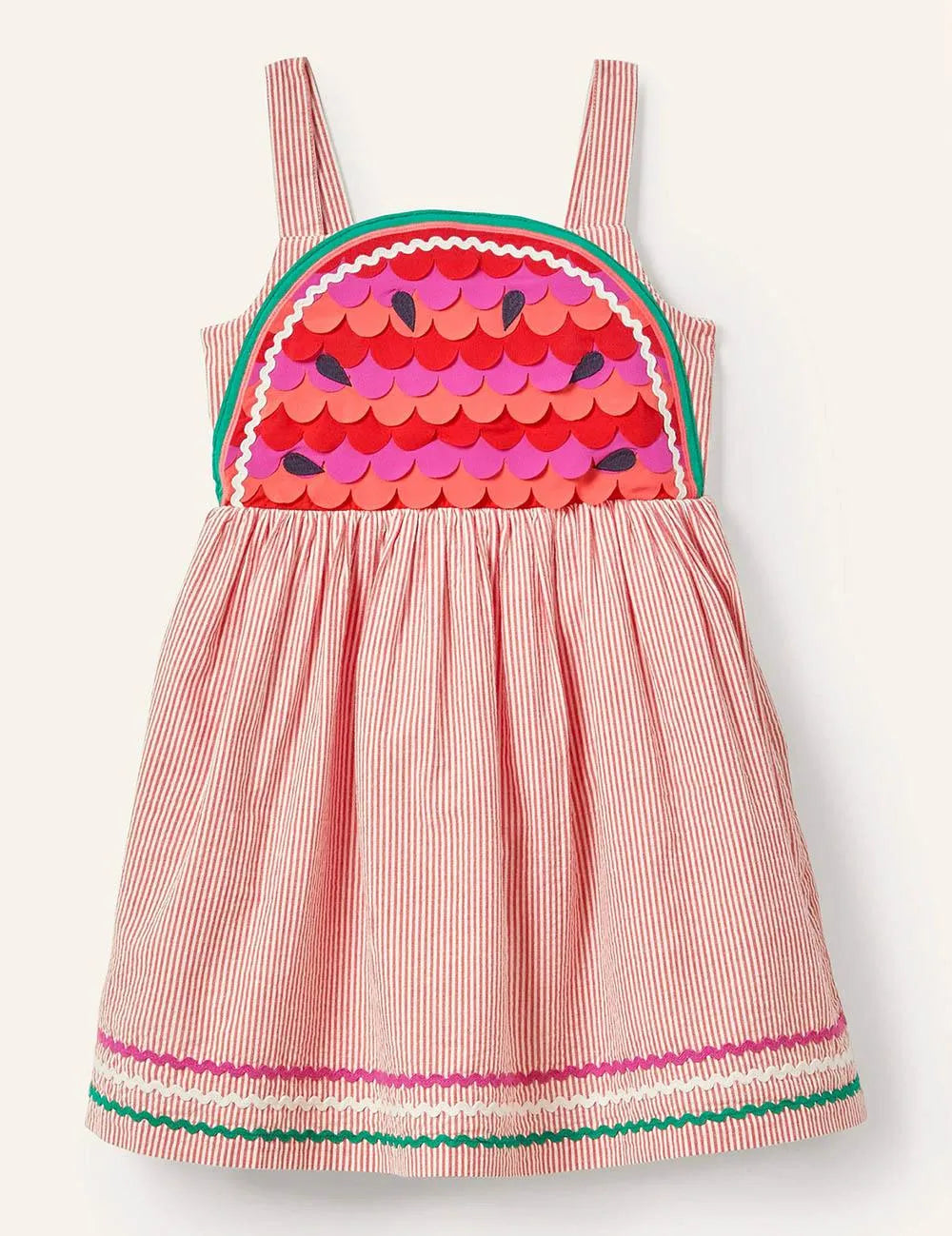 This dress is cute, the fabric is a little stiff but not scratchy. The watermelon top isn’t quite as cute as I was hoping for. I ordered a 2-3Y dress so there are only 2 rows of each color versus 3 in the picture which may be a sizing difference. There are 2 button holes on the straps to make it adjustable and it has a stretchy accordion back for a nice fit. The back of the watermelon embellishments is also lined which is nice.