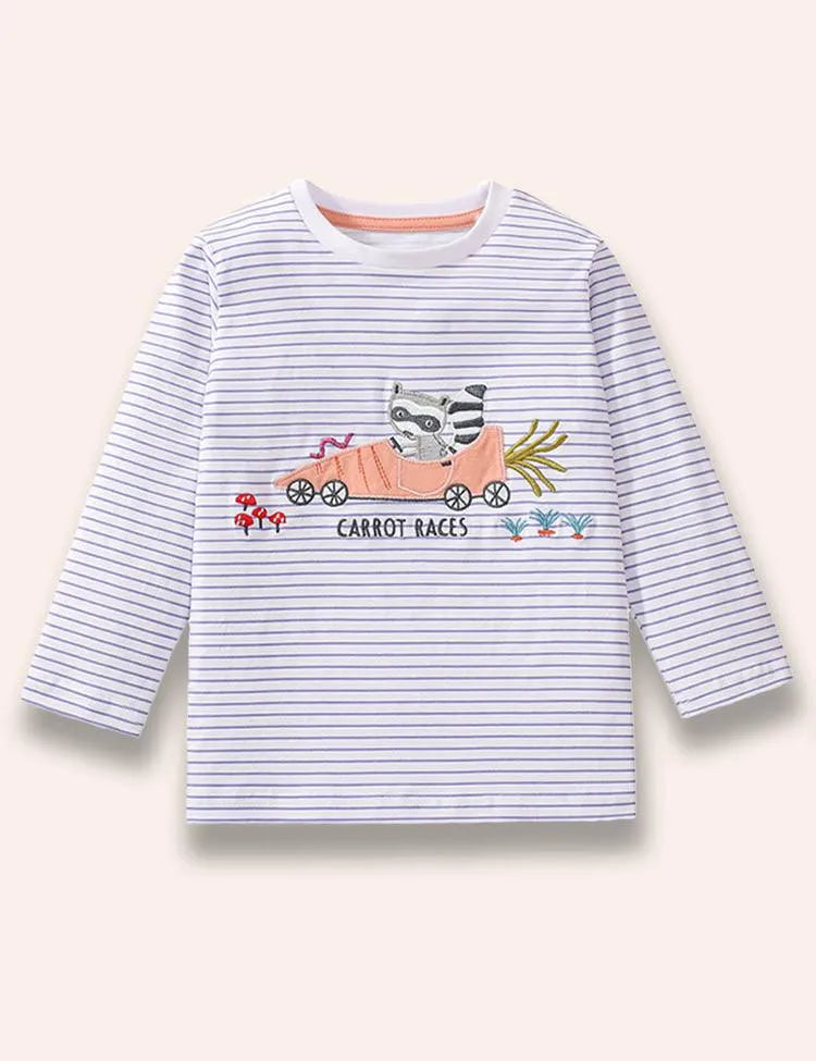 Cartoon Raccoon Appliqué Striped Long Sleeve T-Shirt