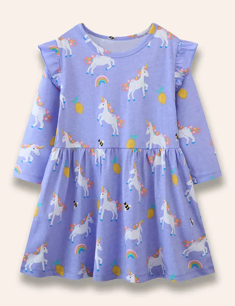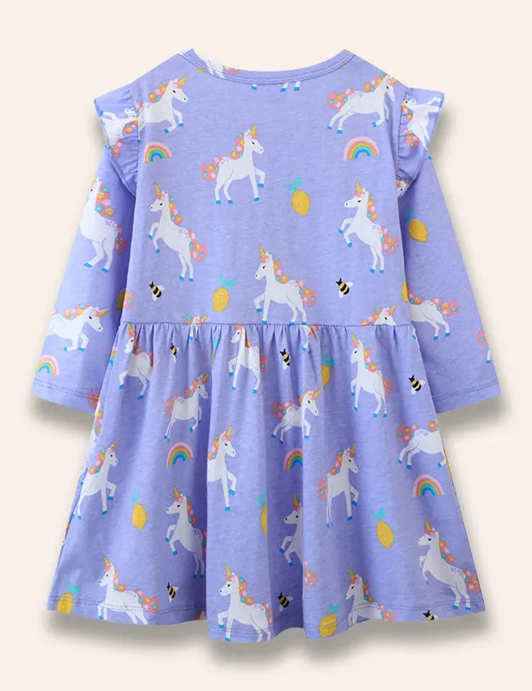 Cartoon Unicorn Printed Ruffled Dress
